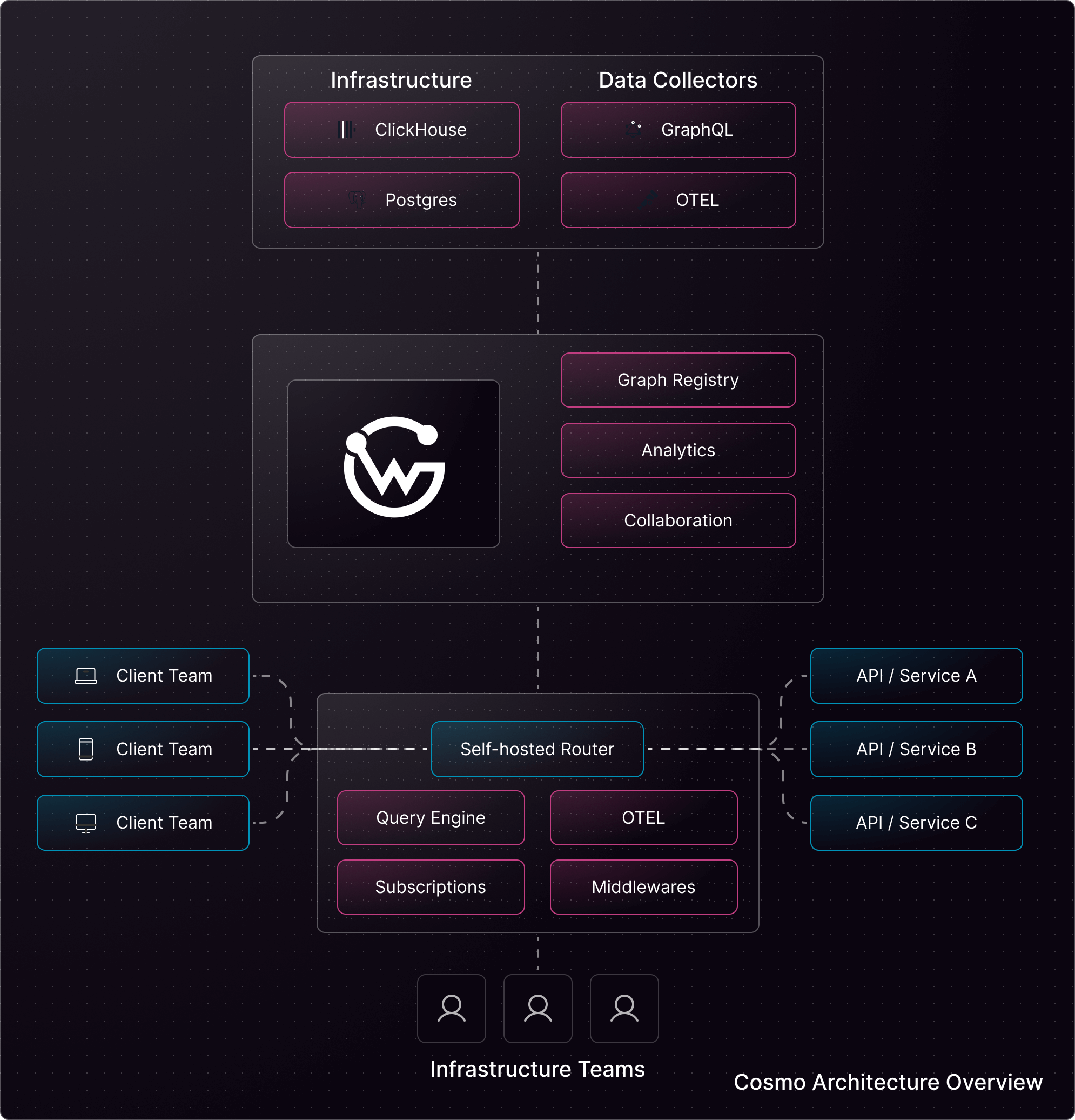 Cosmo is fully open-source and will always remain so. Its extensive range of features makes it one of the most advanced, secure, and cost-efficient GraphQL platforms for both small and large companies. While you have the option to operate the open-source solution independently, we strongly advise considering our services. This recommendation comes from a place of caution and care: Managing a platform at this complexity level without the necessary expertise could pose risks to your business. We’re here to assist, ensuring you make the most of this solution safely and effectively. At WunderGraph, we have an in-depth understanding of how the software works and how to operate every single component.