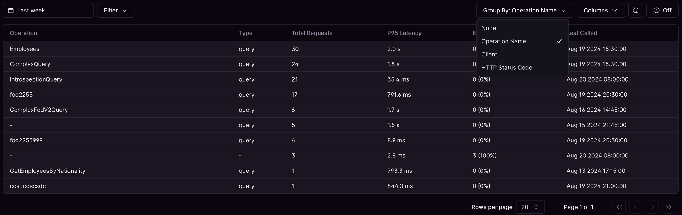 The grouping feature allows you to group the data in the table by none, operation name, client, or error message.- None: The default view with no grouping applied. Each row represents an individual request made to the federated graph.